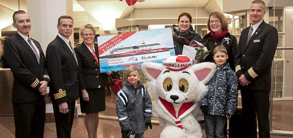 Officially launched in January 2013, Viking Grace has served in on the route between Turku, Finland and Stockholm, Sweden for the past four years. The five millionth passenger was presented with a bouquet of flowers from the ship’s master, Turku's terminal manager and mascot Ville Viking, while everyone onboard was given a glass of sparkling wine.