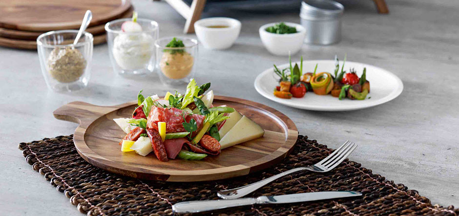Developed using white premium porcelain and organic materials, the Artesano Professionale collection comprises hexagonal plates designed for use with salads and tapas and tiered trays made from acacia wood and slate.