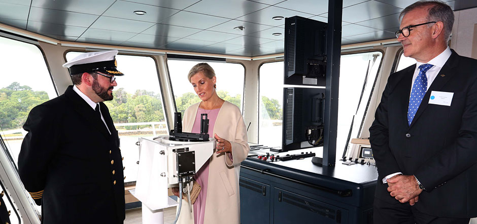 During her visit, the Countess of Wessex toured Victoria of Wight with Wightlink’s chief executive Keith Greenfield and also visited the bridge to hear about the ferry’s environmental credentials from captain Tom Vincent and fleet commodore Peter Hayes. The Countess was also able to speak with the ferry’s designers, crew members and local suppliers, and attend an onboard lunch prepared by local chef Robert Thompson who used locally sourced ingredients.