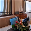 Designed with a nautical theme, the 242-square-foot Officer’s Suite comprises a bedroom, a living room and a full bathroom with a jacuzzi tub. The nautical theme is reflected through elements such as a museum-quality model of a J-class sailing ship, a sextant, binoculars and a print of Wind Surf.