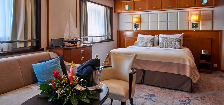 The Officer’s Suite was added during an extensive bow-to-stern renovation, which saw everything from the hull to the guest rooms and public spaces being renovated and updated. In addition, Windstar added 16 new guest rooms to increase capacity from 310 to 342 passengers and expanded the crew accommodation area.