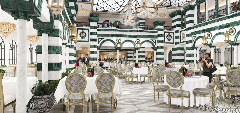 Ristorante dei Medici, which will be located in the aft section of decks three and four, was inspired by Florence’s Santa Maria del Fiore and the adjacent Piazza del Duoma, with white and green marble walls reflecting the building’s façade. Forward of Ristorante dei Medici on deck three is Ristorante Palazzo Vecchio, which takes inspiration from the Florentine palaces Palazzo Vecchio and Palazzo Pitti. Like the two palaces, the restaurant will feature decorative elements including marble flooring, gilding and panel work, chandeliers and velvet, as well as an art gallery showcasing classical Italian paintings.